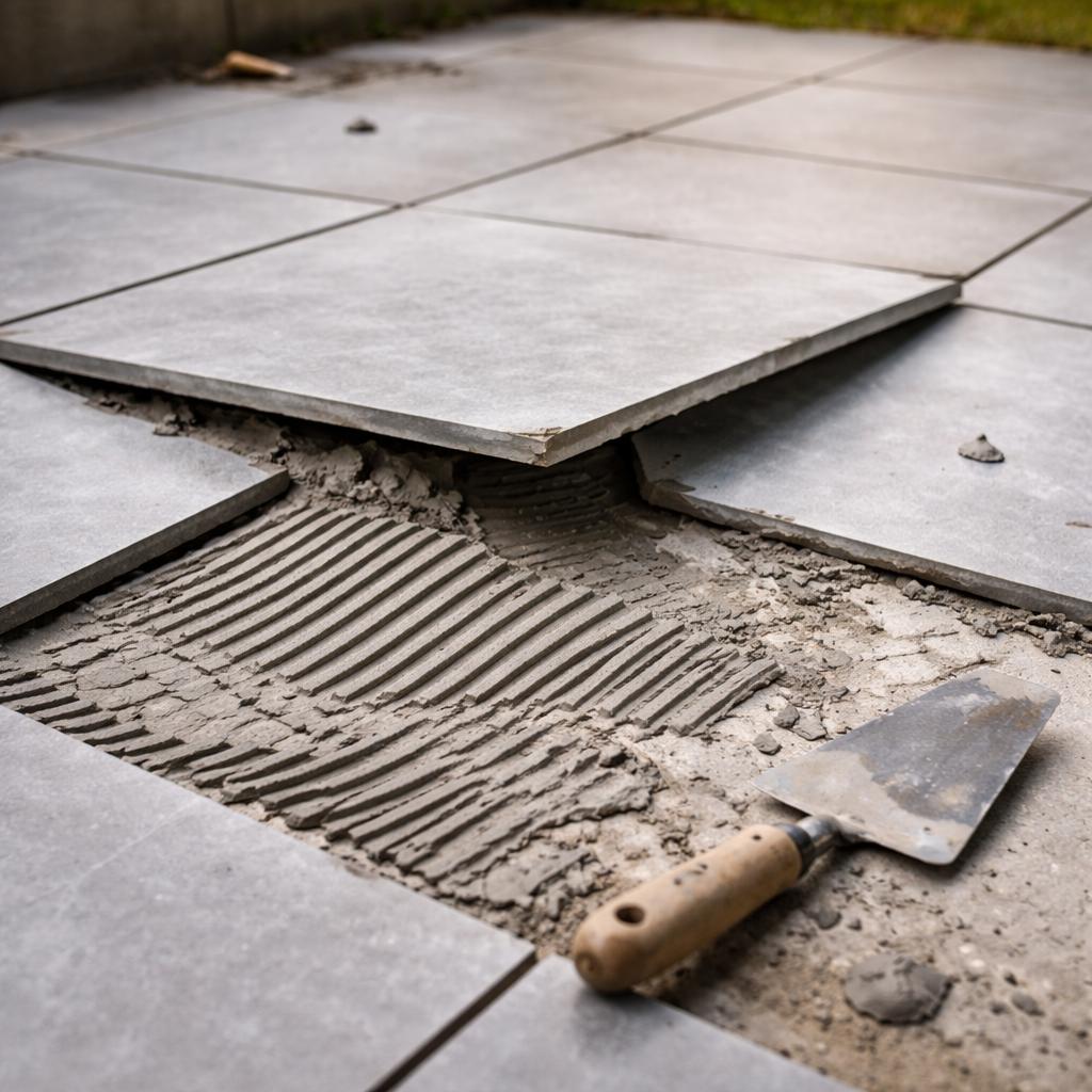 Проблемы с керамогранитом редко проявляются сразу. Сначала всё выглядит нормально: плитка уложена, швы аккуратные, поверхность ровная. Но через месяцы или сезон появляются глухие зоны, отдельные плитки «отзываются» при простукивании, а иногда и отрываются целыми фрагментами. Это не дефект плитки и не случайность — это следствие того, что клей не смог компенсировать хотя бы одно из условий эксплуатации.