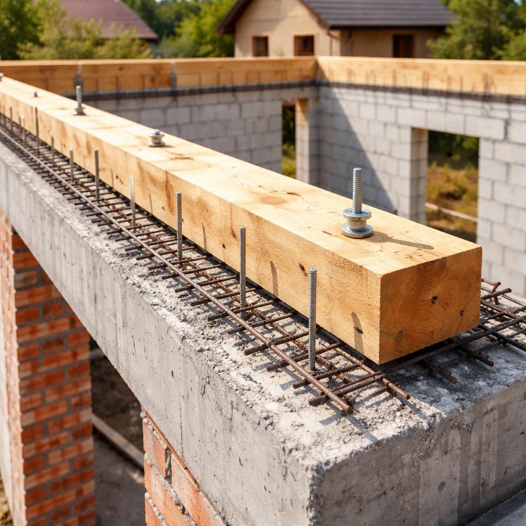 Ещё одна особенность — контакт с мауэрлатом. Здесь встречаются два разных по свойствам материала: бетон и древесина. Армопояс должен создать для мауэрлата стабильное, ровное и предсказуемое основание, чтобы деревянный элемент не «играл» вместе с кладкой и не разрушал её локально.