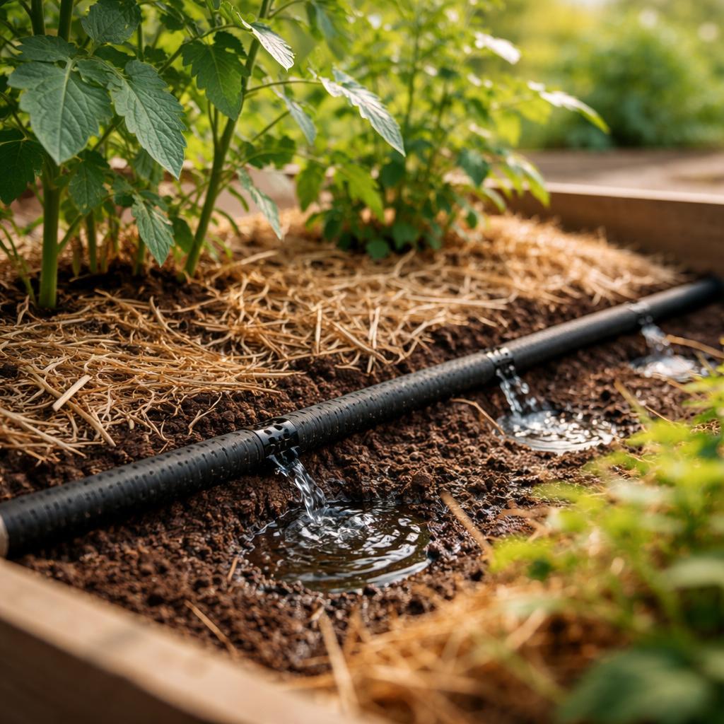 Для установки системы полива внутри грядки часто используется мульчирование, которое помогает удерживать влагу в почве и минимизировать её испарение. Мульча также снижает вероятность появления сорняков, что дополнительно облегчает уход за растениями.