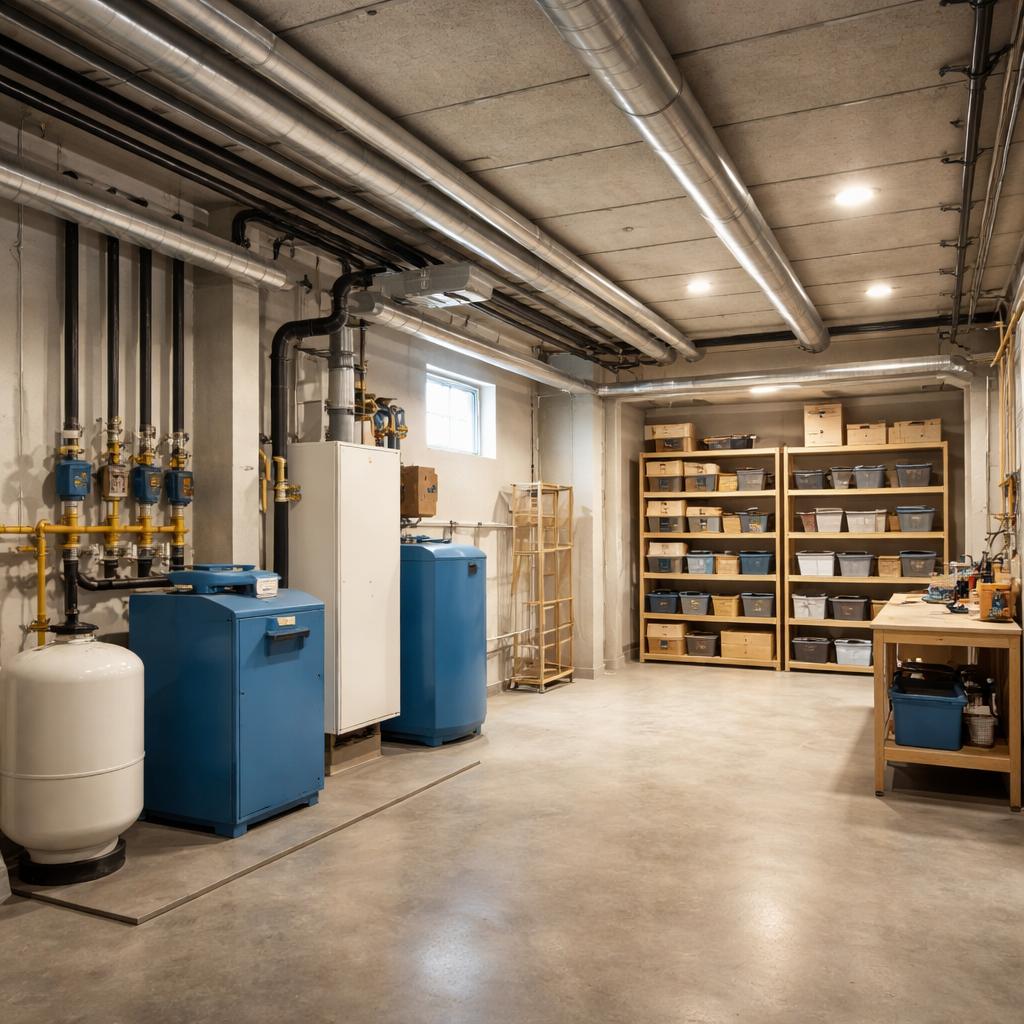 Современный жилой дом насыщен инженерией, и значительная её часть проходит именно через подвал. Трубопроводы, коллекторы тёплых полов, узлы учёта, системы дренажа и электроснабжения требуют пространства не только для монтажа, но и для обслуживания.